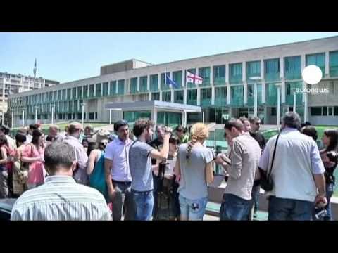 Un petit groupe de protestataires dénonce les atteintes à la liberté de la presse en Géorgie. Quatre photographes ont été arrêtés pour espionnage. Ils sont a...