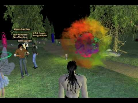 Machinima clip of a gathering of virtual artists in Second Life experimenting with reactive sculptures - objects which change color, size or shape in ...