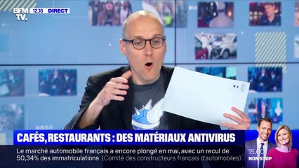 Alors que les restaurants s'apprêtent à rouvrir leurs portes, pas toujours facile de respecter les nouvelles normes d'hygiène et les gestes barrière. De nouveaux matériaux sont en train de voir le jour et pourraient faciliter les choses. Leur particularité: ils détruisent le coronavirus lorsqu'il se dépose. Une PME iséroise a mis au point une toile souple qui peut servir aussi bien pour une table de restaurant qu'un bureau d'écolier, et qui incorpore des particules d'argent, très efficaces contre les micro-organismes. En outre, une PME lyonnaise a mis au point un velours qui supprime le virus dès qu’il est en contact avec la lumière du jour. Parmi les applications possibles de ce tissu décontaminant: des banquettes de restaurant, des sièges dans les transports en commun ou des dessus de lit dans les hôtels. Enfin, on voit aussi apparaître des peintures antivirus. - Culture Geek, du lundi 1er juin 2020, présenté par Anthony Morel, sur BFMTV.