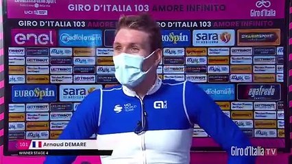 Après une attaque en solitaire de son coéquipier Miles Scotson (Groupama-FDJ) dans le dernier kilomètre, Arnaud Démare a réussi à gagner au sprint d'un rien devant Peter Sagan (BORA-hansgrohe) et Davide Ballerini (Deceuninck-Quick Step) sur la quatrième étape du Tour d'Italie. Parfaitement emmené par son poisson-pilote Jacopo Guarnieri, le Français signe son onzième succès de la saison, le premier sur ce Giro à l'occasion de la quatrième étape.