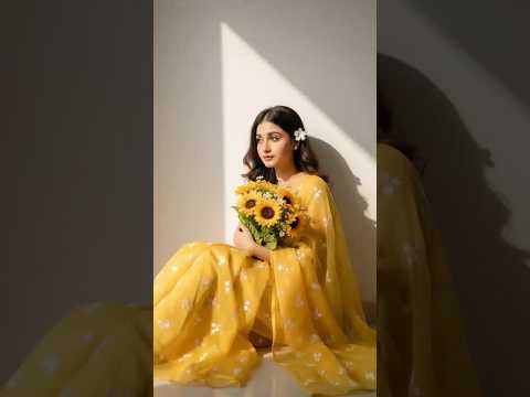 Create a soft, sunlit portrait of [your face] wearing a flowing sheer yellow saree with delicate floral embroidery.She sits gracefully against a pain wall,bathed in warm natural light with atringular patch of sunlight casting artistic shadow.She holds a vibrant bouquet of sunflowers close to her chest and a small white flowers is tucked behind her ear. Her gentle expression, loose hair strands moving slightly, and the dreamy golden glow create a serene, poetic and romantic?