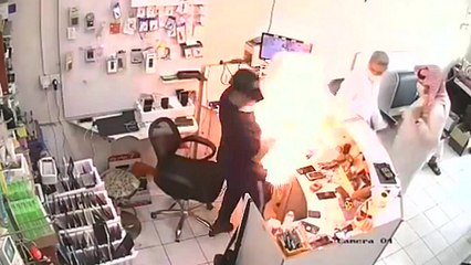 Dans un magasin spécialisé dans les réparations de téléphone à Tabuk, en Arabie saoudite, la caméra de surveillance a filmé le moment où une batterie de téléphone explose. Heureusement l'homme maitrise très rapidement le feu et par chance, il n'a pas été blessé durant l'explosion.